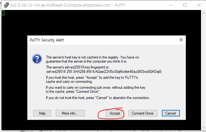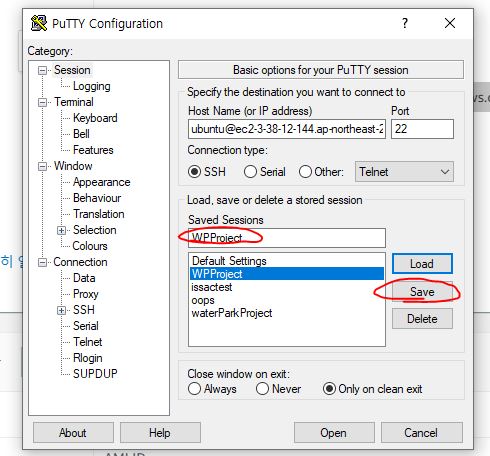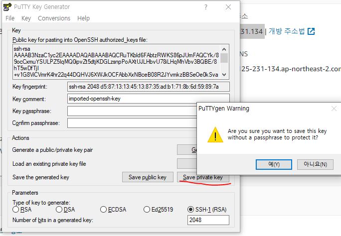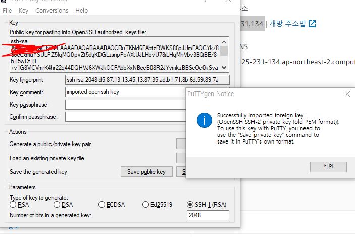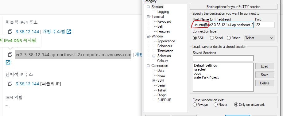 - 생성이 끝나면 puttygen을 종료하고 생성한 EC2 퍼블릭 주소를 카피한 후(ubuntu@)는 리눅스 기본 로그인 주소 putty를 실행하여(puttygen 아닙니다) 복사 붙여 넣기 해줍니다