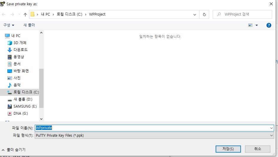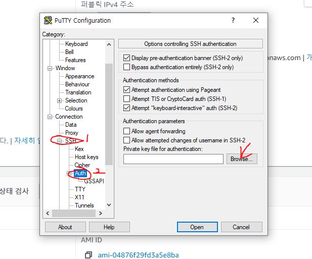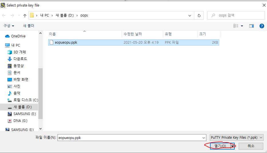 - puttygen을 실행하여 EC2에서 생성한 key를 넣어준다(단, 아래 그림표시처럼 allfile로 바꿔줘야 찾을 수 있음)'