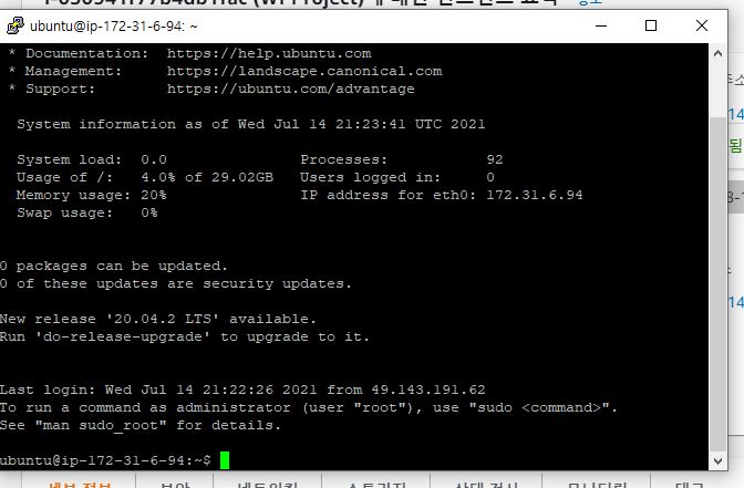 - 그러면 아래와 같이 가상 서버에 이렇게 자동으로 ubuntu계정에 로그인하게 됩니다