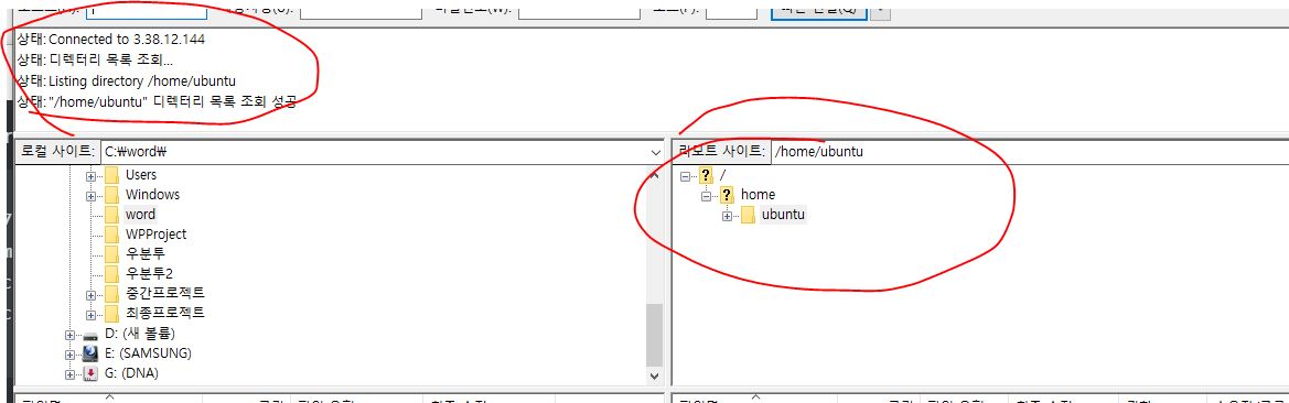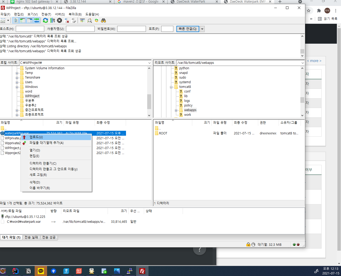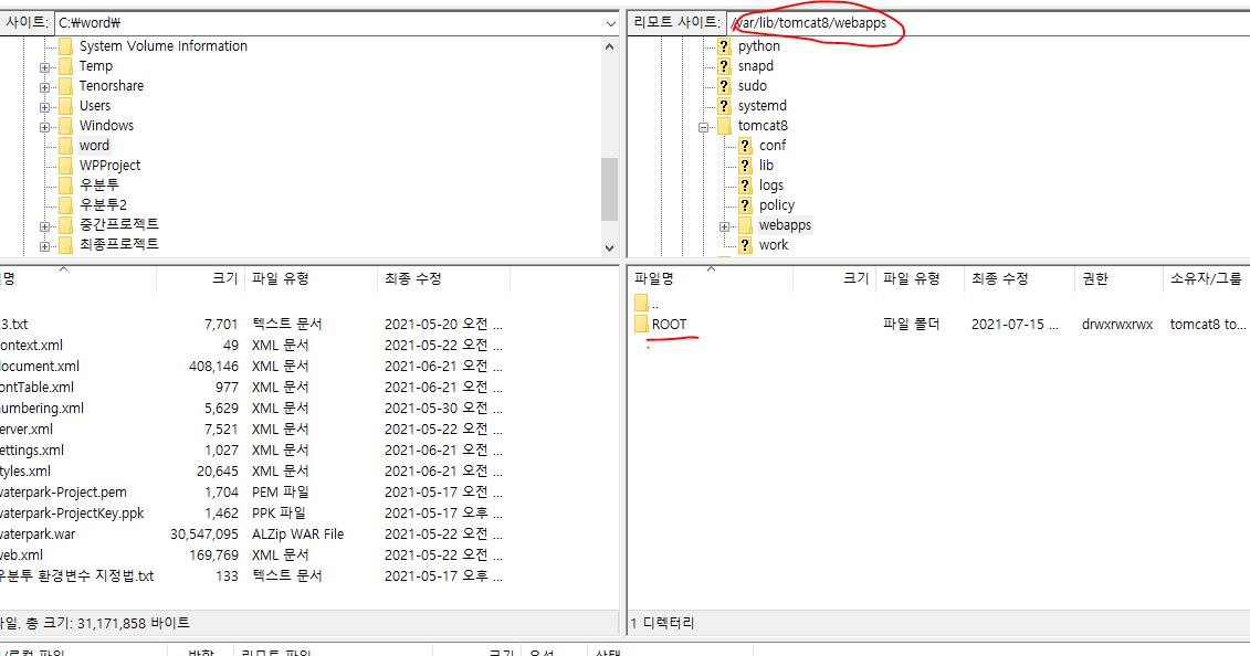 - 이 폴더에 왼쪽편에있는 로컬 사이트 (내컴퓨터)에서 아까저장한 war파일을 업로드해줍니다.(그림)