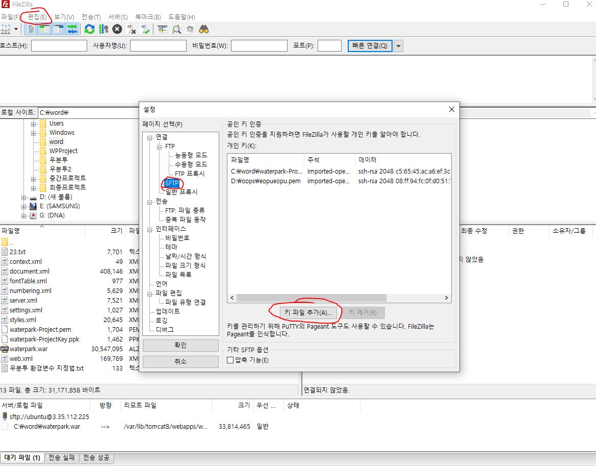 - 화면에서 좌측상단 편집→설정→SFTP에 들어가시면 키를 추가할 수 있습니다.(그림)
