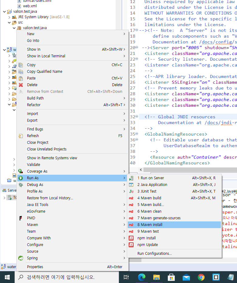 - 이제 저같은 경우에는 만들어 놓은 spring 프로젝트에서 Maven install을 누르면 일정 시간후 스냅샷 생성이 완료됩니다(war파일)(그림)