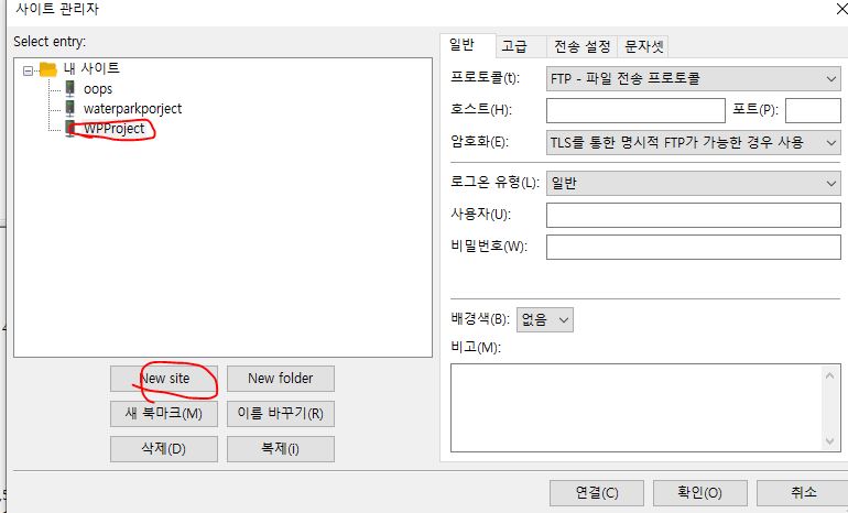- 나오셔서 서버모양의 그림을 누르시면 사이트 관리자가 뜨는데 new site를 눌러주시고 이름을 지정해주십시요(그림)