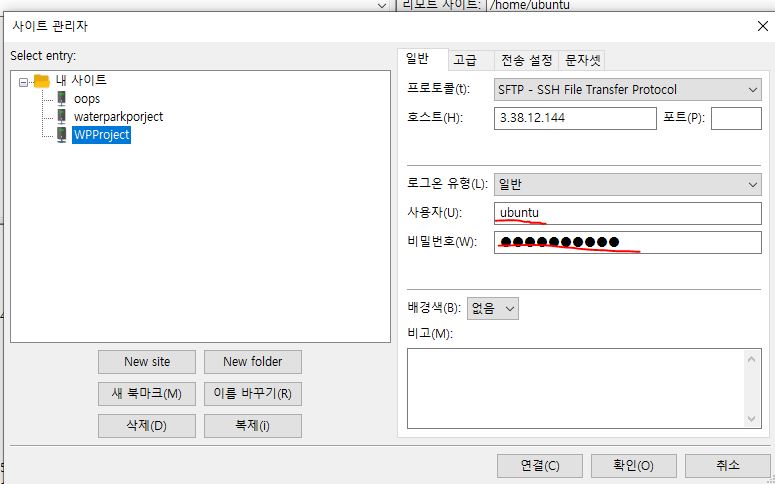 - 다음은 호스트네임을 지정해 주어야하는데 저희 Ec2에서 받은 ipv4 서버를 가져와 주시면됩니다(프로토콜은 아까지정해준 SFTP로 지정해주세요)
