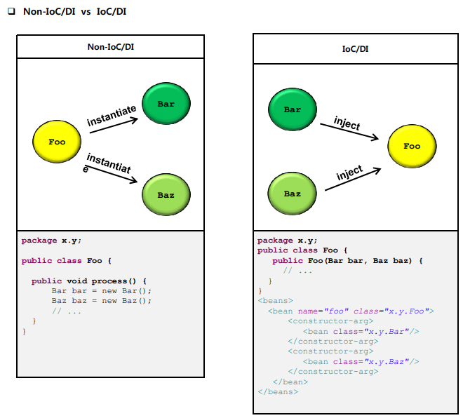 - IoC는 객체가 필요하는 객체를 내부가아닌 외부에서 주입(Inject)를 받아서 사용하는 것이다