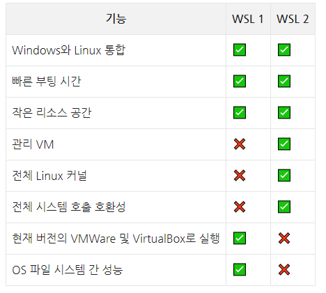 - 큰 차이가 있는점은 WSL1에서 사용하던 리눅스는 리눅스 System Call 을 Windows API로 변환하는 구조였는데 WSL2 는 윈도우즈에 리눅스 커널을 아예올려버렸다.
