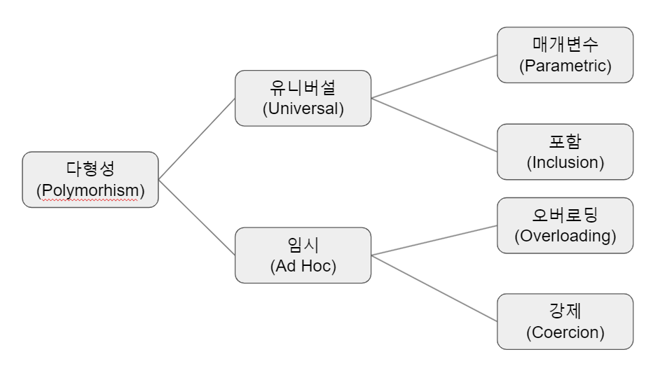 - 유니버셜 다형성은 매개변수와 포함이 있고 임시(애드혹)의 경우 오버로딩과 강제를 가지고있다.