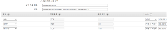 - 보안 그룹 구성에서는 인스턴스에 대한 트래픽 제어와 방화벽 규칙인데 프로토콜을 설정해준다(SSH는 리눅스) 소스에 경우 서버에 접근을 보안 등록해 두지 않을 시에 혹시 모를 말도안되는 비용이 나올 수 있어 안전하게 현재 위치 IP를 받았다.