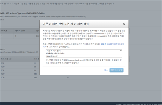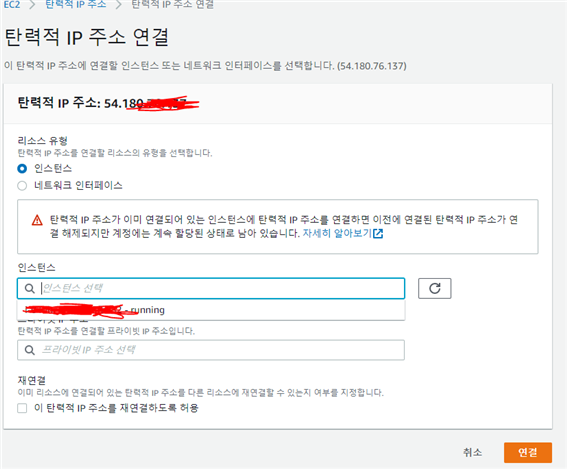 - 이런 화면이 나오는데 인스턴스 선택을누르면 지금 현재 있는 ec2인스턴스 리스트가 나오는데 원하는, 방금만든 인스턴스 ID를 선택하고 연결을 누르면 생성이된다.