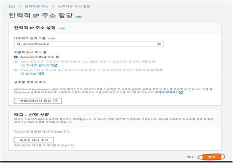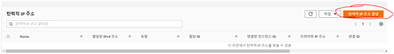 - 이렇게 탄력적 IP주소를 조회할수 있는 페이지가 나온다 우측상단에 탄력적 IP주소 할당을 클릭한다