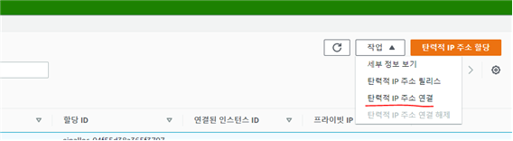 - 여기서 이제 인스턴스 ID와 연결 해 주는데 원하는 IP를 클릭한 후 오른쪽 상단 작업을 클릭한 후 탄력적 IP주소 연결을 선택해 들어가면