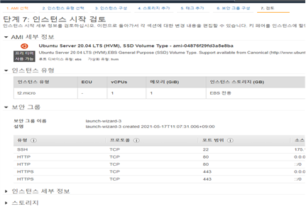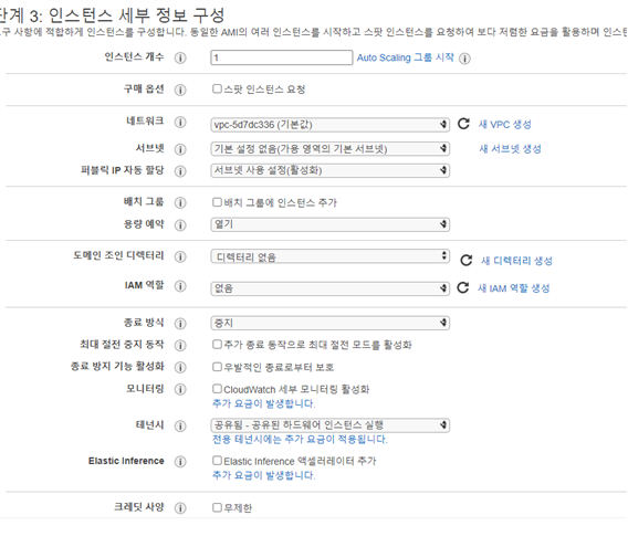 - 다음을 누른 후 인스턴스 세부정보 구성이 있는데 아마존에서 default값으로 제공되는 기본정보 그대로 넘어간다